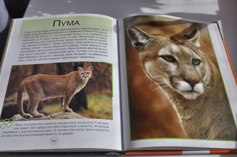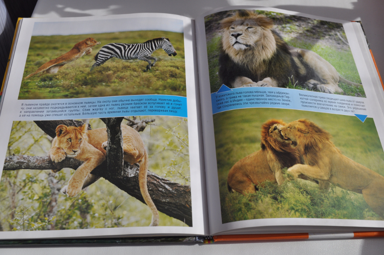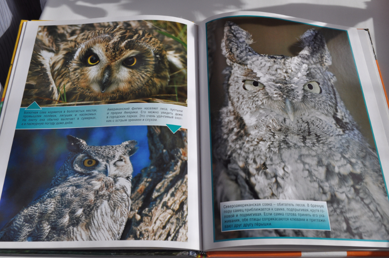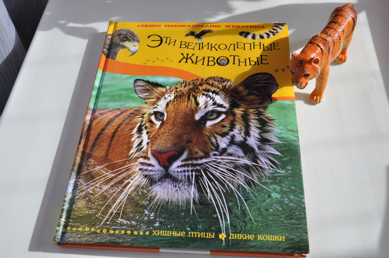"Эти великолепные животные" от Росмэн. Очень красивая энциклопедия. Этакий подарочный вариант, в пухлой обложке на мелованной бумаге. Иллюстрации Андрюша часами рассматривает, текст читаем тезисно. Именно в этой книге только про хищных крупных птиц и хищных кошек. У нас много энциклопедий о животных, но эта подкупает своим оформлением.