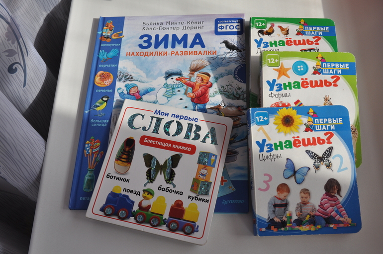 "Мои первые слова". Блестящая книжка. Эта малышковая книжечка Андрюшке очень нравится, не знаю почему)) Там просто крупные картинки, которые разбиты по темам и блестящие элементы. Любит просто перечислять, что нарисовано. К слову, тоже бралась в Фикс Прайсе)