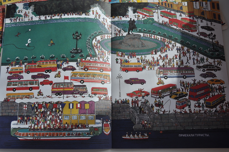 В. Бундин "Куда торопятся машины" изд. Речь. Невероятная книга. Особенно для мальчишек и пап. Задействованы и форзац и нахзац. Это любимый Андрюшкин разворот, где туристы гуляют)
