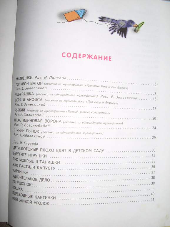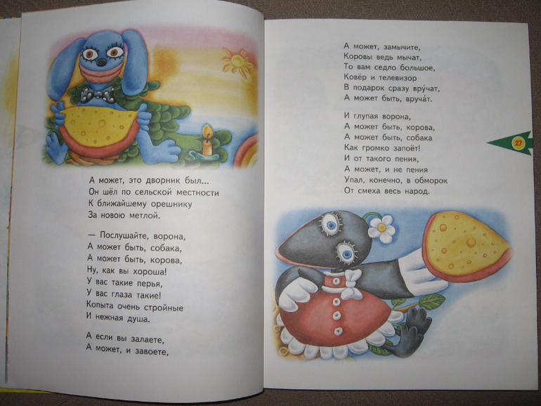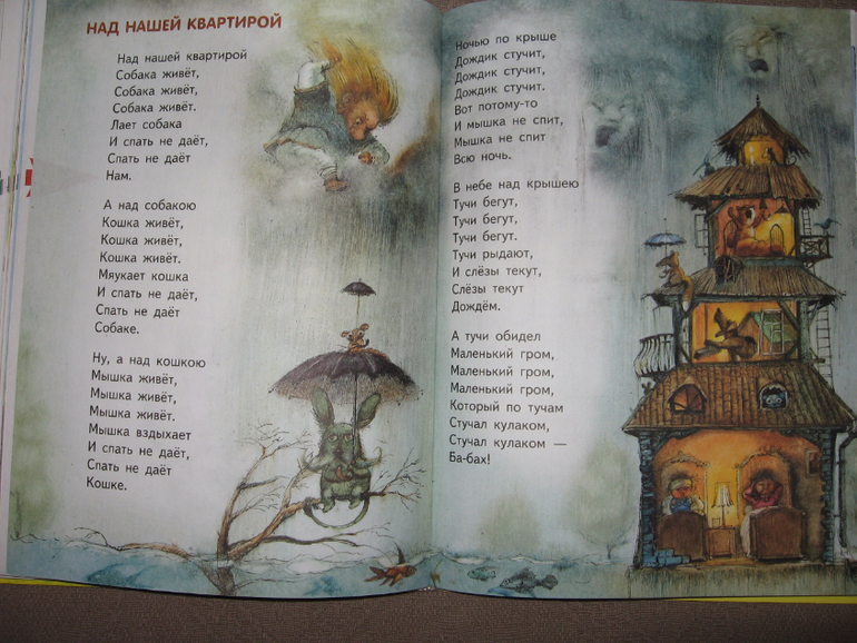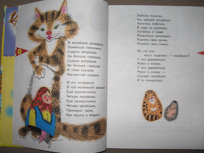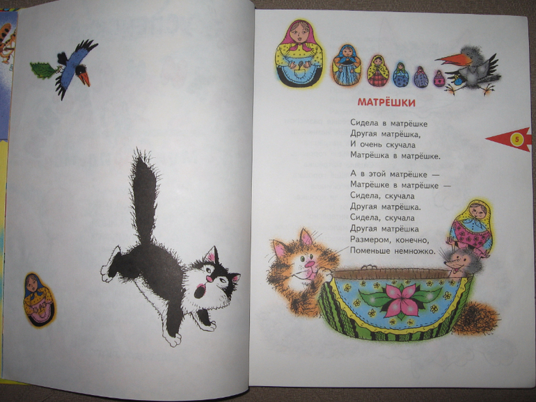 Сама книга большого формата (примерно с лист А4) и довольно объемная. Стихов и песенок внутри примерно 60-70 штук. Они разные по размеру, поэтому книга долгоиграющая, подойдет для чтения как малышам, так и уже детям постарше. Вначале идут несколько песенок, потом коротенькие и простые стихи, а дальше стихи удлиняются и усложняются)