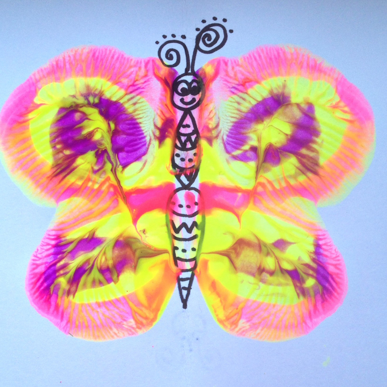 Я сложила лист пополам, на одной стороне красками нарисовали крылья и отпечатали на другую сторону. У нас были краски икея.
