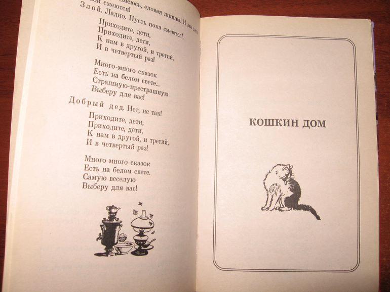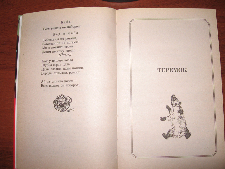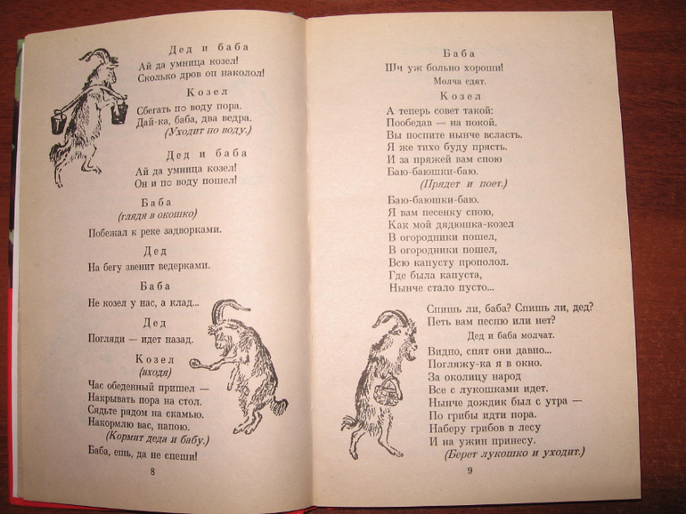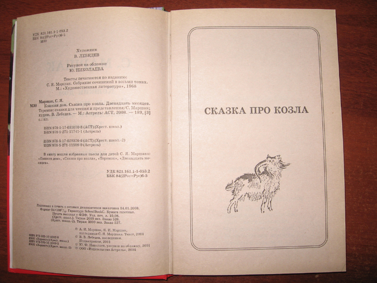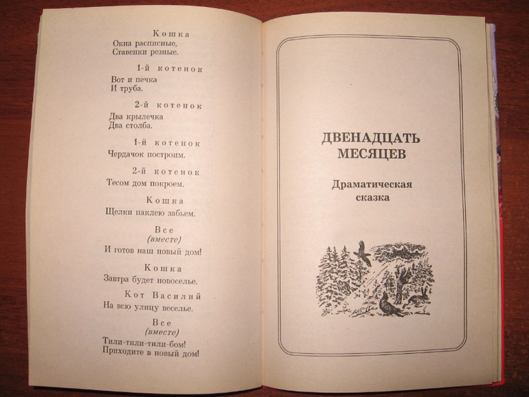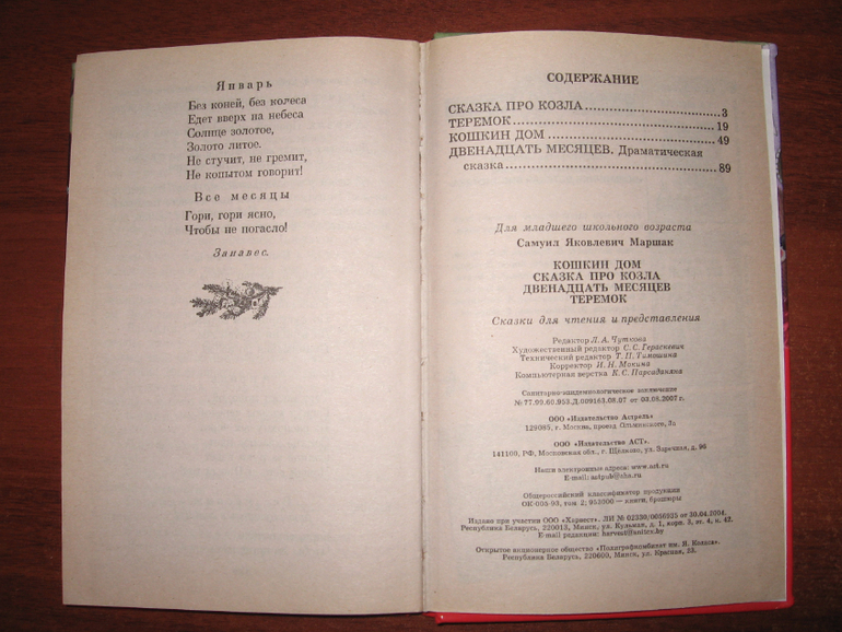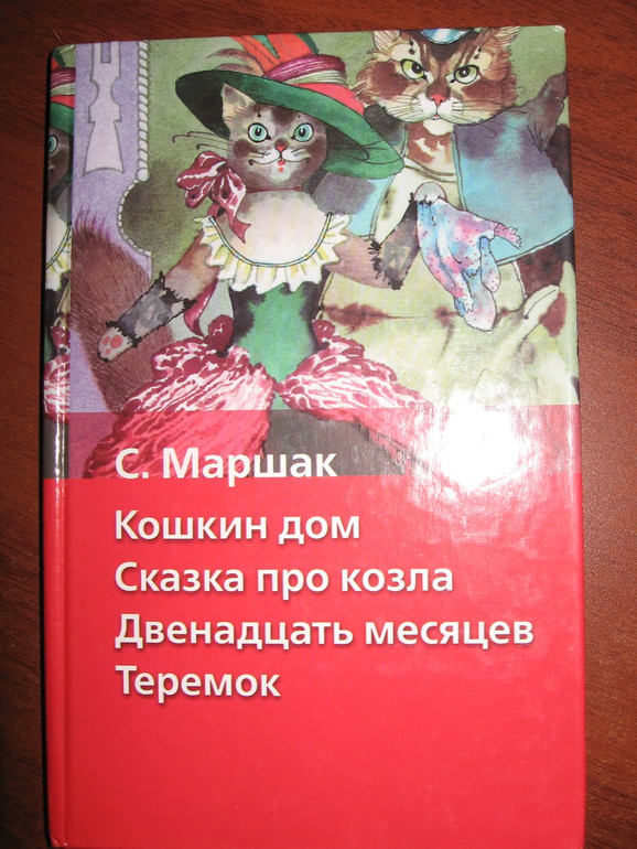 На обложке сразу видно какие сказки и сколько их в книге. Из этих четырех полностью и неоднократно читали "Сказку про козла" и "Теремок". "Кошкин дом" читали фрагментами и. чаще всего, заканчивали просмотром одноименного мультфильма. На "Двенадцать месяцев" пока даже и не заглядывались)) Хотя вот сыну думаю уже можно и предложить почитать)