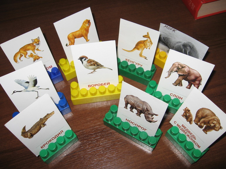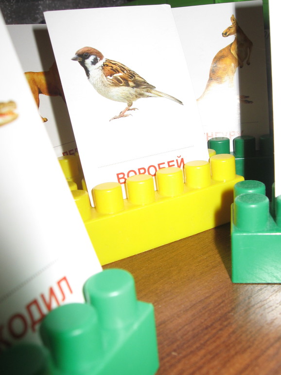 Так вот, что мы придумали. Просто брали детальки, вставляли туда карточки с животными и разыгрывали сценки. Вот, например, набор для стихотворения "Где обедал воробей?"