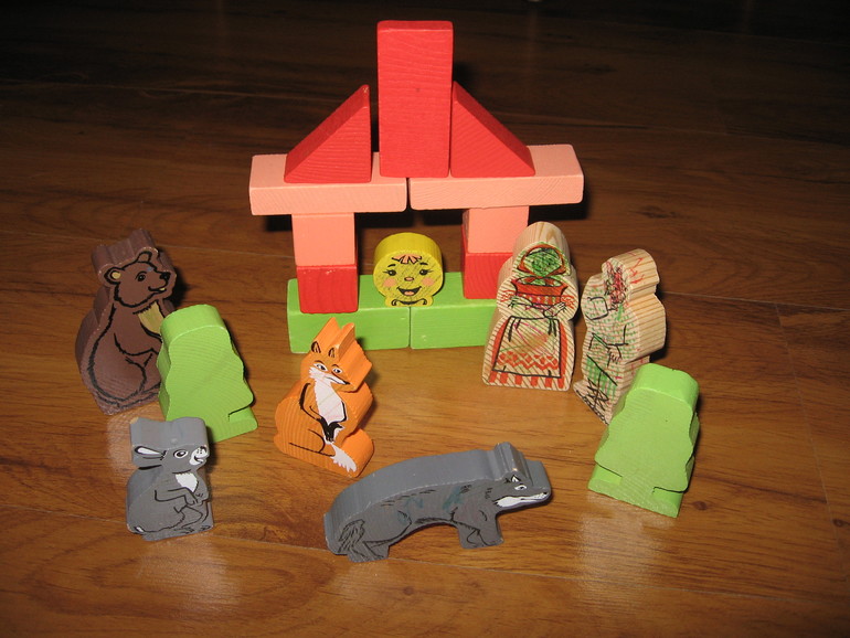 Собственно и Колобку досталось от дочи. Ей показалось, что художник недостаточно талантливо выполнил роспись, и, не мудрствуя лукаво, дама его перекрасила. У бабушки лицо стало зеленым, у деда - красным, избушка, вообще, стала черно-зелено-голубой. Поэтому изба у нас чаще строится просто из кубиков в разных вариациях.