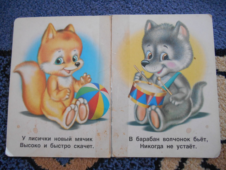 "Учимся говорить" Милые иллюстрации, коротенькие стихи, дочке очень нравится, особенно разворот с волком и барабаном. Осталось по наследству от сына, вряд ли можно где-то купить.