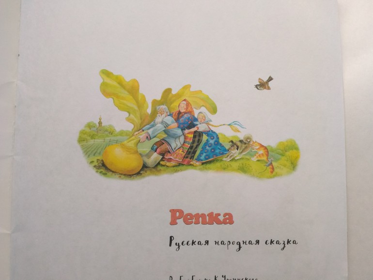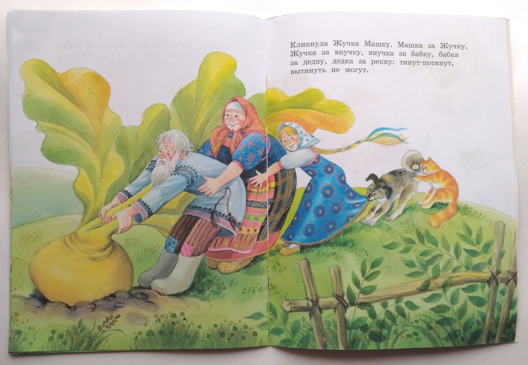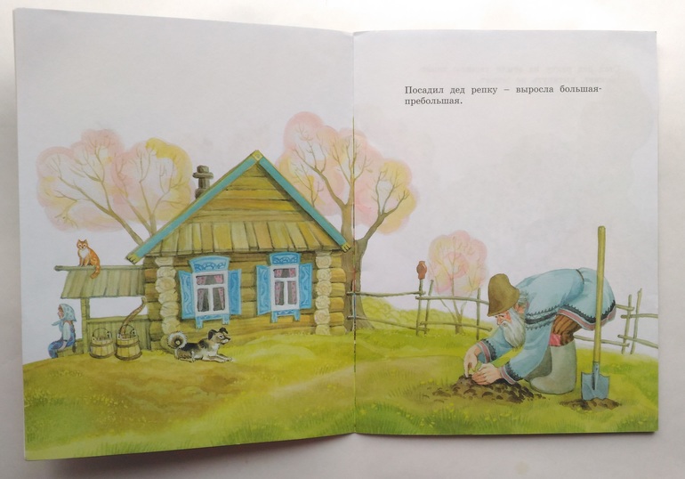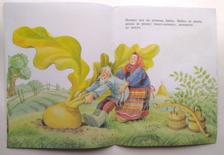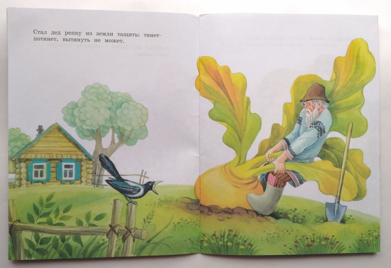 В целом мы обе от нёе в восторге. Она практически идеальна по моим меркам, хотя есть некоторые мелкие нюансы. Ну вот почему фразу "выросла большая-пребольшая" поместили на развороте, где репки еще и нет в помине? И вообще эта первая фраза, как по мне, какая-то куцая здесь.