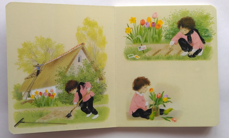 Прикупила к новому сезону вторую книжицу из серии Герды Мюллер о временах года (зимнюю показывала вот здесь ранее). Уж больно нам первая полюбилась, и решила я-таки всю серию собрать. По итогу, вторая вызвала у меня гораздо более противоречивые эмоции. Во-первых, весна здесь совсем "не наша". Ну я, конечно, понимаю, что книга не русскоязычная... Но почему в зимней книге снег есть, а в весенней его нет вовсе? Везде сплошная зелень, цветы и размножающиеся животные. Во-вторых, меня смущает главный персонаж. Я так и не определилась с его полом. Конечно, на 70% где-то я уверена в его мужской принадлежности, но сомнения между тем не покидают. В-третьих, сюжет. Здесь у меня никак не вяжется цельный рассказ, даже несмотря на филологическое образование и способность высосать из пальца одной фразы разглагольствование на общую тетрадь. В общем, покажу вам в этот раз все развороты книги, а вы судите сами: