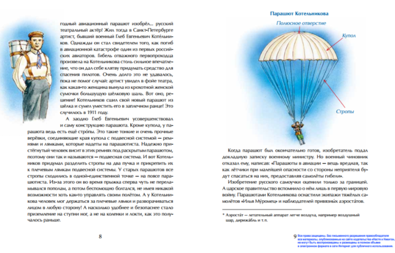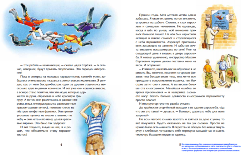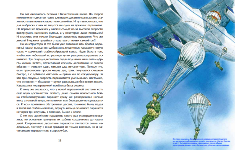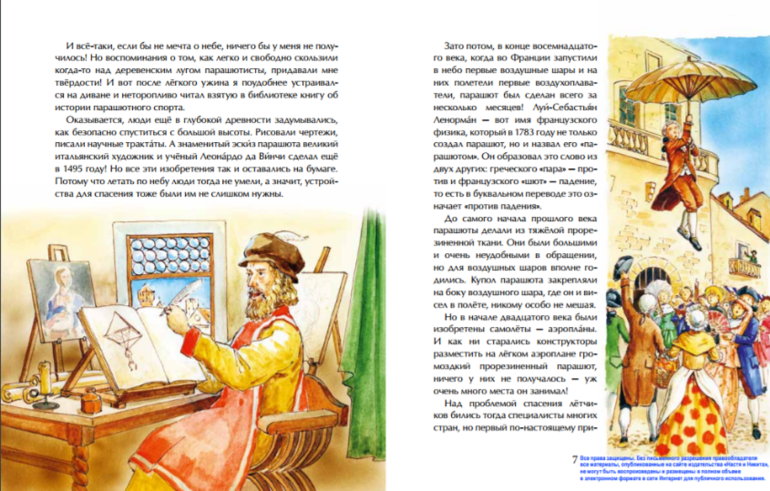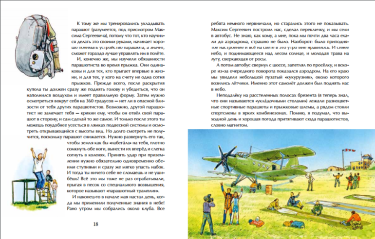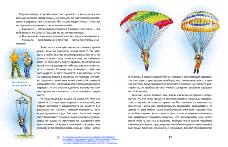 Тренировки в аэроклубе и история парашютного спорта стали для героя этой книги удивительным приключением, которое позволило ему сделать шаг в небо, а нам - узнать много интересного: о чертежах Леонардо да Винчи, о первом изобретателе парашюта, о воздушно-десантных войсках и, конечно, о том, чему учат начинающих парашютистов и какие правила надо соблюдать во время прыжка.