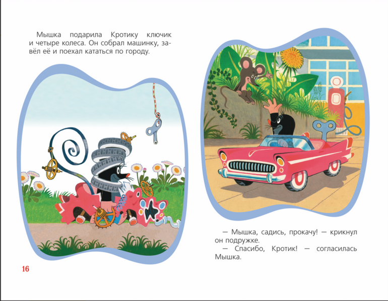 И текст очень сильно сокращен! Кротик и машинка начинается с того, что мышка подарила Кротику ключик от машинки, получается в сравнении с желтой книгой пропущена большая часть истории. И сюжет получается изменен, в большой книге Кротик сам ищет способ починить машину.