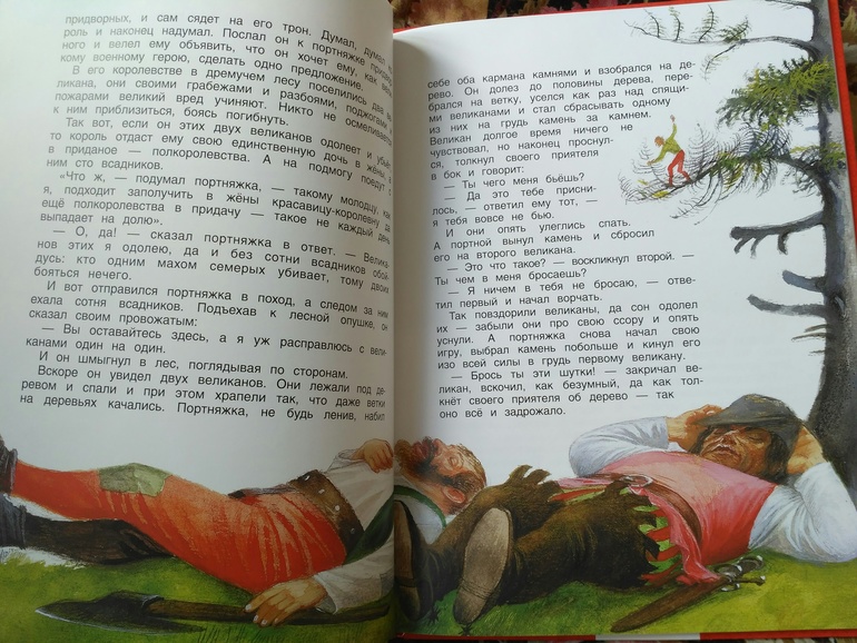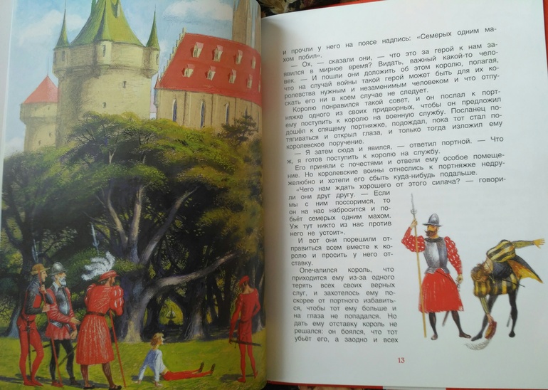 Сказка хоть и длинная но интересная, все время что-то происходит. Дочь на протяжении всей сказки переживала за портного, восхищалась его находчивостью и смекалкой. Во время чтения мы останавливались и пытались предложить как же выполнить задание короля , ну а потом были удивлены, как здорово портняжка решает такие сложные задачи.