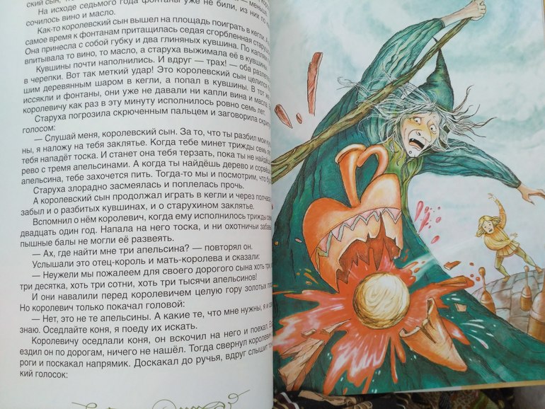 Сами герои тоже волнуют воображение - королевский сын, феи,принцессы, дочери короля апельсиновых деревьев. Одноглазый великан - сторож, который спит с открытым глазом, трехглавый змей.