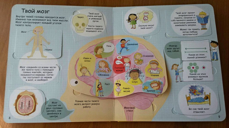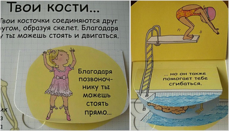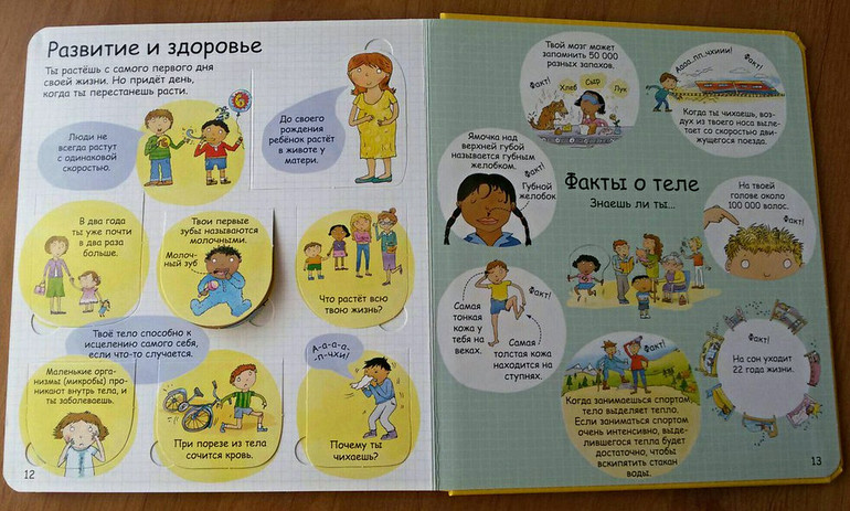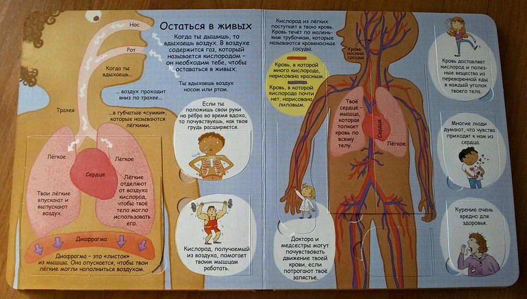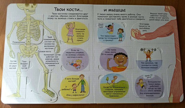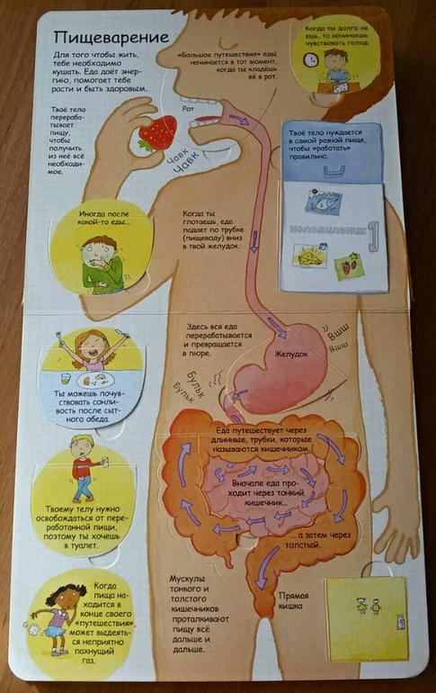 В нашем доме уже давно живет и пользуется большой популярностью энциклопедия от Робинс "Секреты человека" с окошками. Это была наша первая книга про человеческое тело. Наверное, для многих поиск книг по данной теме - дело сложное. И я не исключение. Все, что очень хотелось, уже закончилось в продаже. И наконец-то, в одном из отзывов я наткнулась на эту книгу. Я ни разу не пожалела, что ее купила. Мою тогда четырехлетку она увлекла очень надолго. Разворот про пищеварение мы знаем наизусть. Почему-то именно он больше всего интересовал дочку. Также в энциклопедии содержится информация о костях и мышцах, мозге, чувствах, развитии и здоровье. Приведено множество интересных фактов: