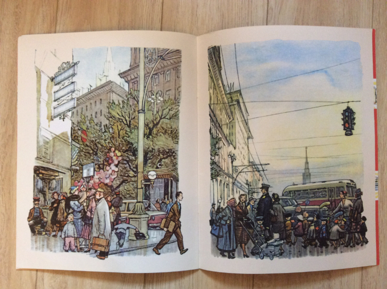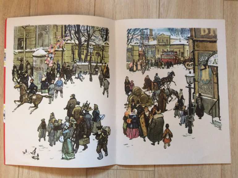 Об иллюстрациях хочется сказать отдельно. Проиллюстрирована книга художником Федором Викторовичем Лемкулем. Вот бы нам сейчас таких иллюстраторов.... Они красивые, там есть что рассматривать, очень реалистичные, показывают все времена и то как менялись люди и техника. Есть два разворота просто для рассматривания. В самом начале сказки и в самом конце.