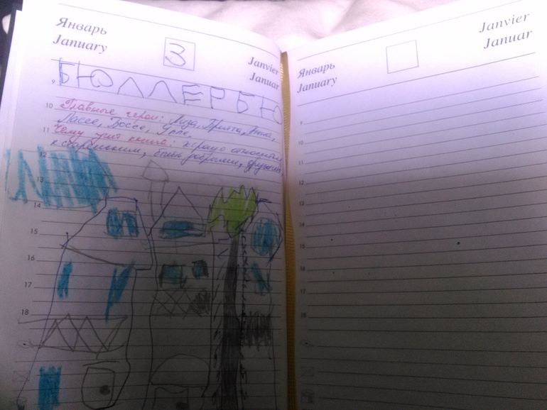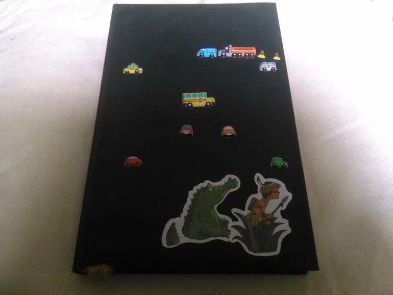 Идею как раз увидела у вас, девчонки. Подумала, что можно, и правда, записывать что-то туда иногда, обсуждать, учиться по дороге писАть и рисовать на заданную тему. Долго искала на лабе дорогущие блокноты в твердых обложках, а потом поскребла дома по сусекам и нашла старый недатированный ежедневник и...ВУАЛЯ!)))) Сын сам креативил с обложкой.