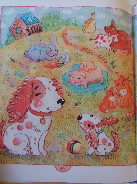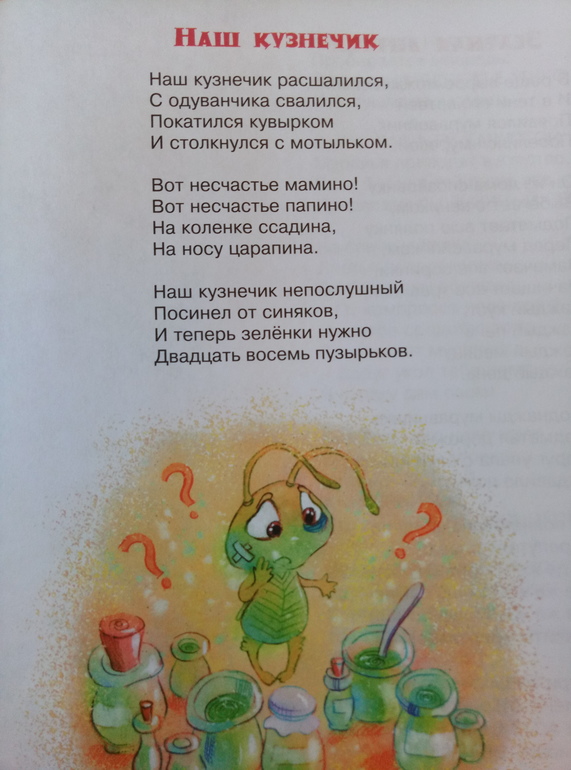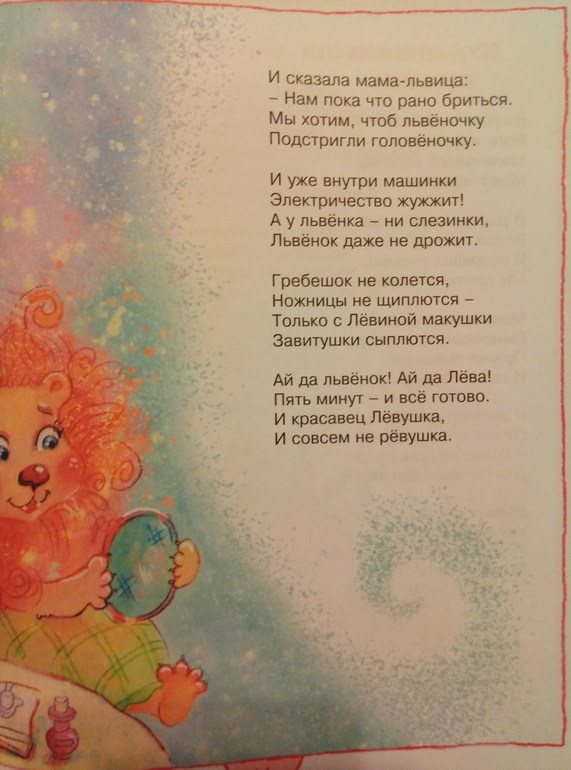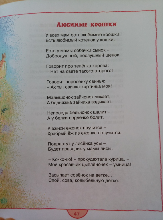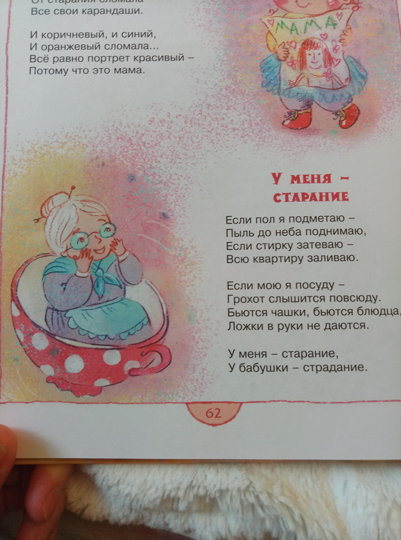 Я когда ее получила, пришла просто в неописуемый восторг!Чудесная книга с отличным содержанием и милыми, по хорошему детскими, теплыми и радостными рисунками!Я только содержание посмотрела, и пришла в умиление от названий подразделов: Наши крохотули, наша хруняша, стишата- коротышата, букашечки, почемустики и чевостики)