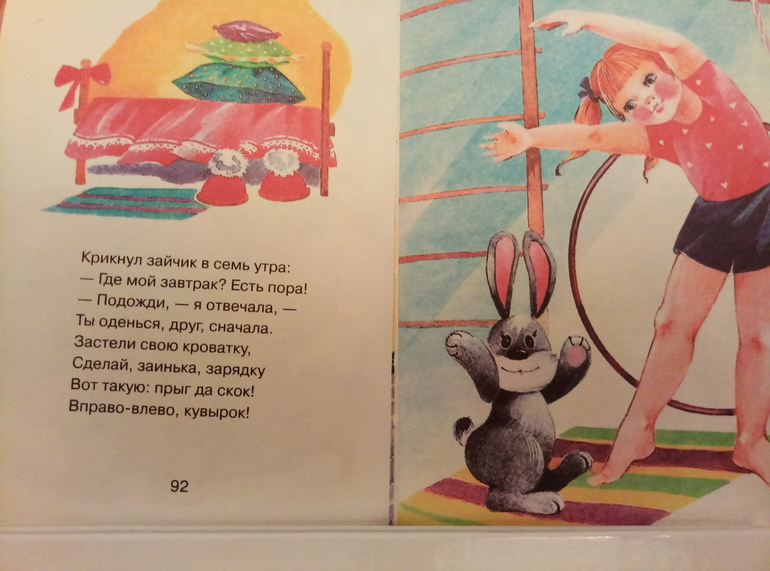 Я когда начала читать, то восторгу моему не было предела! Я очень люблю стихи с описанием различных детских действий в течении дня, а именно вот проснулись, умылись, погуляли, и так далее, они хороши и для режима и для негласного стимулирования бытовых навыков, умыться, зубки почистить, покушать и так далее. Да и вообще их можно приговоривать в нужный момент с ребенком. Из этой серии я люблю Дружинину Зайкин день, наизусть почти знаю, и часто в течении дня нужные строчки рассказываю.