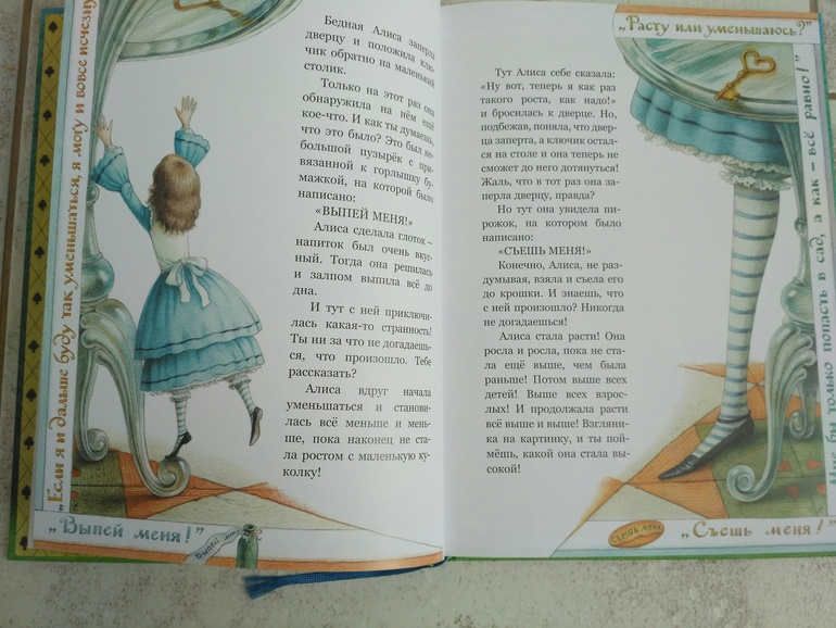 Особенно понравилось дочке как Алиса то становилась то маленькой, то большой! Это и правда удивительно! Выпила напиток - стала маленькой, ростом с маленькую куклу. Потом съела пирожок, и стала большой, выше взрослых. А какие наглядные иллюстрации!