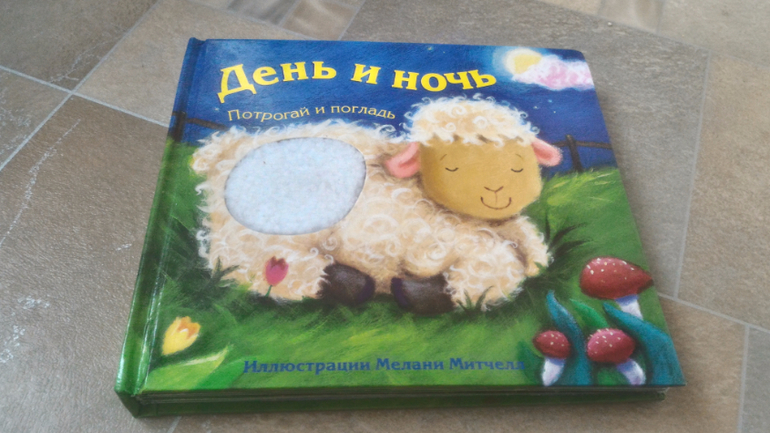 Еще из подобного "День и ночь" от "Мозаики-синтез". Здесь на каждой странице небольшие тактильные вставки, можно потрогать и погладить котенка, щенка, ягненка, крольчонка. И как бонус - на последней страничке накрыть малышку одеялом. Мира особенно это любит)