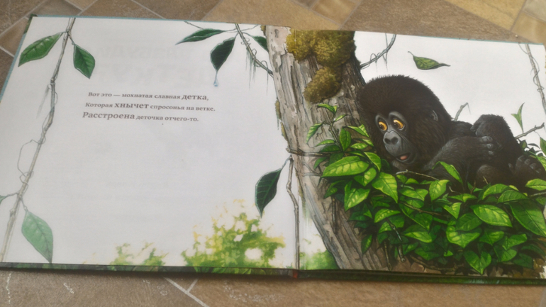 Следующую книгу я горячо рекомендую мамам всех маленьких деток - от рождения и лет до 3-3,5. "Кто разбудил детку" мы читаем с обоими детьми уже полгода и никому она не надоела. Купила её, прочитав восторженный отзыв здесь, в ДК, и ни капли не пожалела. Она великолепная - яркие, красочные иллюстрации, интересное стихотворение, действие нарастает, как снежный ком: вот на ветке проснулась и захныкала маленькая горилла, оказалось, что ее разбудил бегемот, которого переполошила зебра, которую испугал свои рыком лев, которого разбудил крокодил, которого потревожил лягушонок, которого своим жалом перепугала пчела. А виновником всего переполоха оказался...мотылек. Такая вот весёлая история в стихах в духе "Дома, который построил Джек"