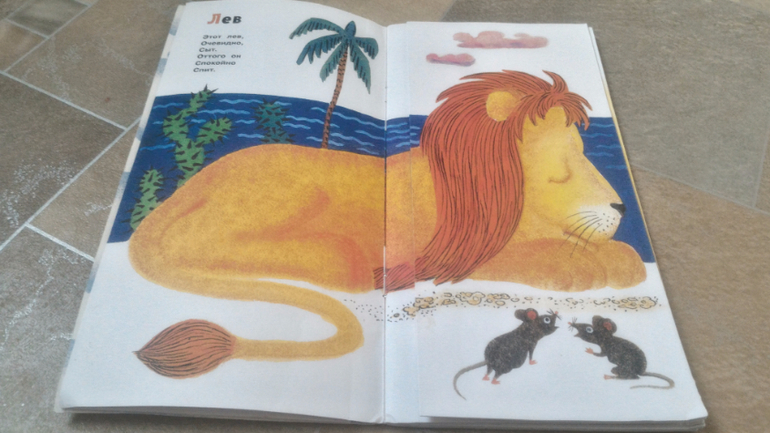 Читали Б.Заходера "Что снится моржу". Прекрасная книга, уже много раз в сообществе о ней писали, присоединяюсь ко всем восторженным отзывам. Самый любимый у Миры разворот - со львом