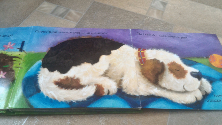 Читали лабиринтовские картонки про котят и шенят. Уже довольно спокойно к ним относится, а раньше пищала от восторга.