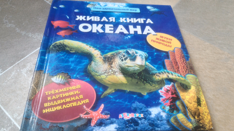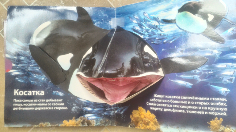 Любит очень "Живую книгу океана" от Азбукварика. Мне тоже нравится. Книга-панорамка, когда открываешь страничку, раздается характерный для какого-то морского обитателя звук или просто плеск волн. С интересом узнала, как разговаривают косатки и пингвины. Также сбоку выдвигается страничка с информацией о животном (его длина, что ест, где обитает). Эта книга обеспечивает мне 5 минут покоя, Мира смотрит её сама.