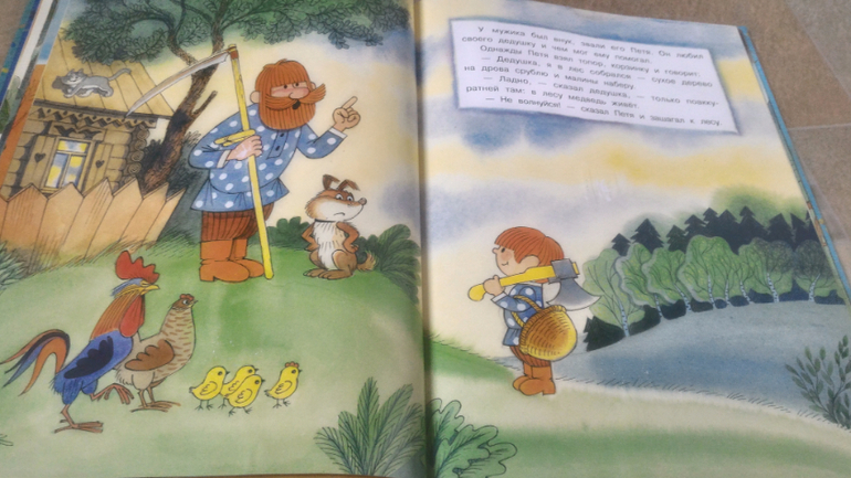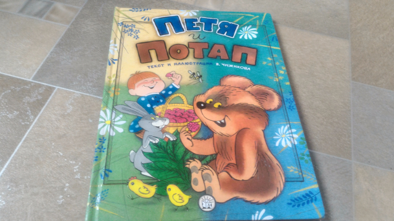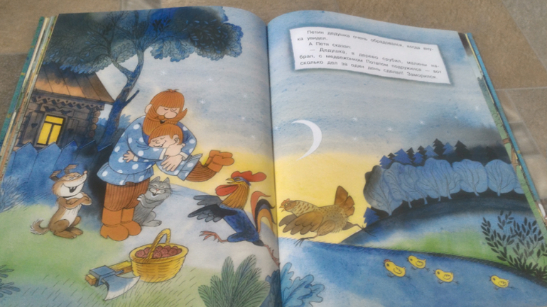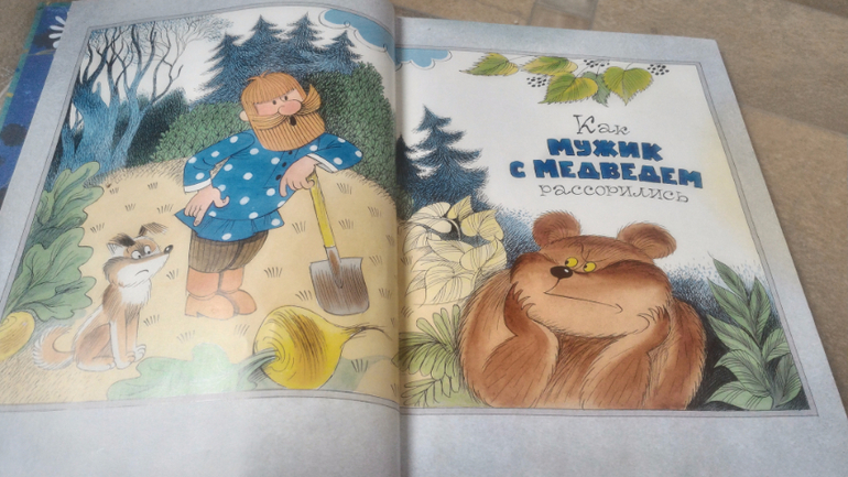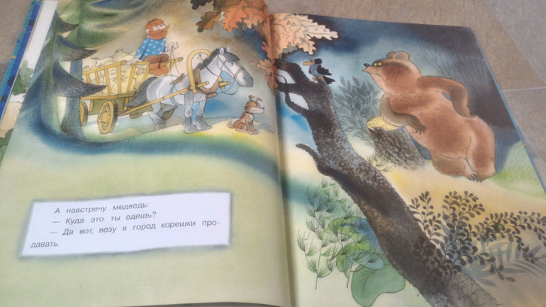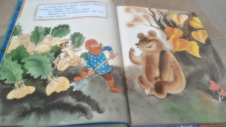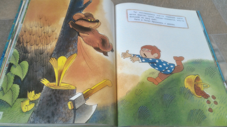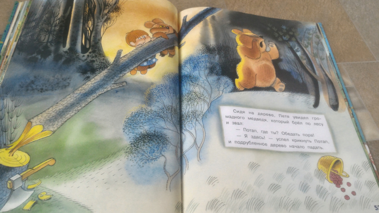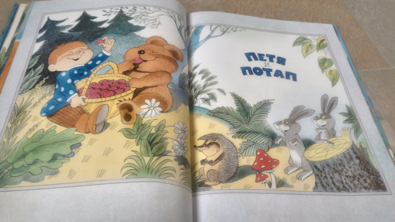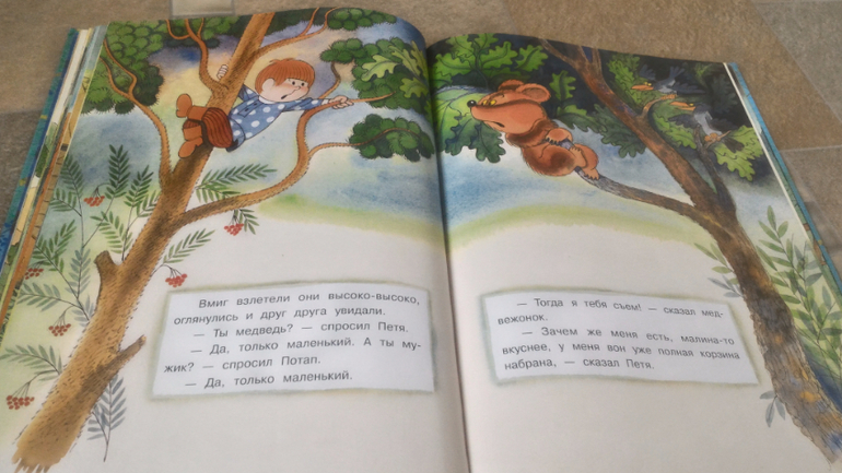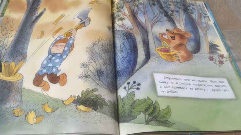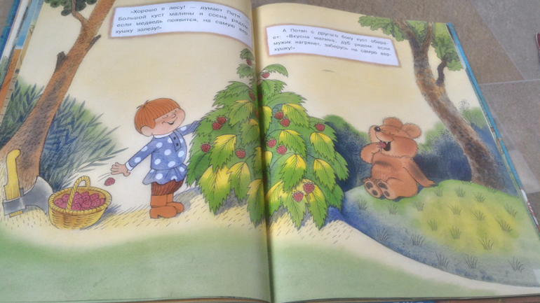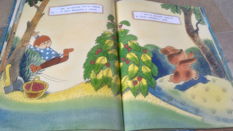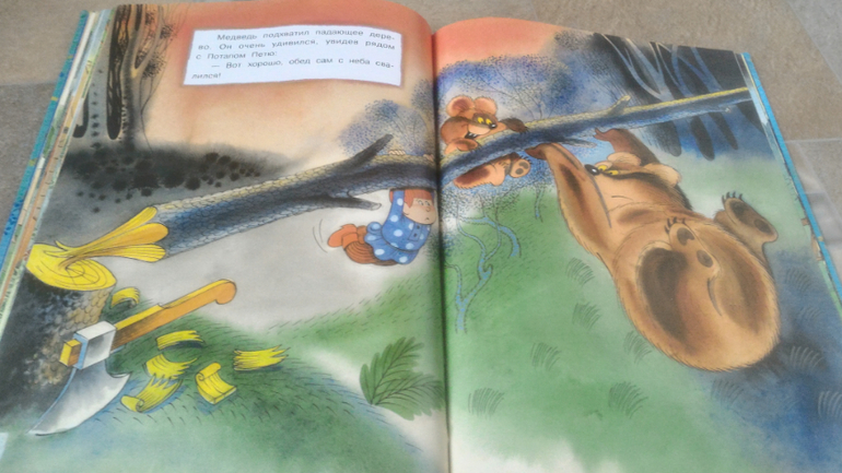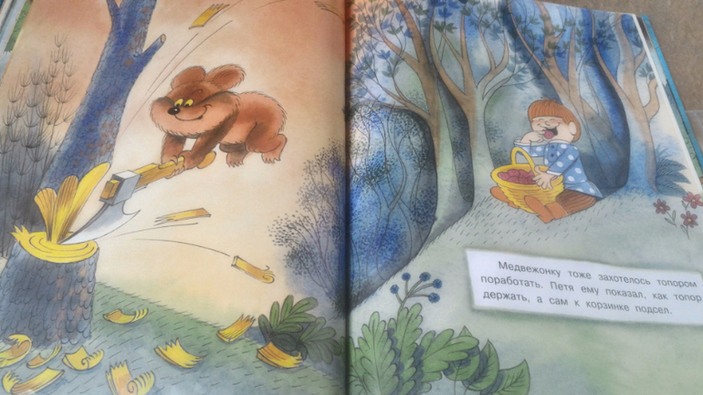 И последняя книга, на ней хочу остановится подробнее. Это В.Чижиков "Петя и Потап" от "Лабиринт-пресс" (умеют же они делать детские книги!!). Почему-то в сообществе она редко мелькает, как-то незаслуженно мало внимания ей уделяют, а зря - книга великолепная. В ней 3 сказки. Первая - это пересказ русской народной сказки "Вершки и корешки", вторая - это, собственно, "Петя и Потап", а третья - "Петя спасает Потапа". И всё это с великолепными иллюстрациями автора, на плотной мелованной бумаге формата больше А4. Ну первую сказку все знают, во второй рассказывается, как подружились мальчик Петя (внук мужика) и медвежонок Потап (внук старого медведя), а вот третья сказка довольно слабая, на мой взгляд. Читаем её только со старшим сынок, Мира книгу после "Пети и Потапа" захлопывает. Эту часть слушала только 1 раз и, видимо, не впечатлилась. В ней рассказывается о том, как медведя с медвежонком решил убить злой охотник, а Петя устроил ему западню и отправил - ТА-ДАМ - в космос. Вот это момент мне больше всего и не нравится - "С тех пор Злой Охотник в космосе летает, привык к состоянию невесомости. Космонавты его подкармливают: хоть и злой, а все-таки человек". Меня этот момент коробит, муж вообще сквозь зубы читает, Но сын слушает, его ничего не смущает)