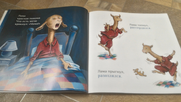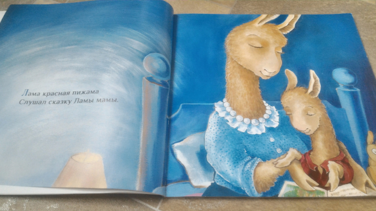 Читали "Ламу Красную Пижаму". Мне кажется, Мире здесь нравится певучесть текста, постоянное повторение этих слогов "Ла" и "Ма". Вообще, книжка не обязательная, на мой взгляд, просто милая история про ребенка, который не хочет засыпать без мамы. Рисунки хороши!