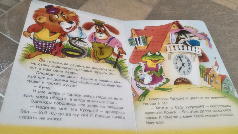 Еще из этой серии читали "Часы с кукушкой" С.Прокофьевой. Иллюстрации здесь мультяшные, мне не нравятся, но Мира, в принципе, опознает кошечку, собачку и т.п. Не знаю, что она так понимает по тексту, но книгу эту постоянно мне носит. Вообще, сама сказка мне очень нравится - она про то, что каждый должен заниматься своим делом, у каждого есть своё место в жизни.