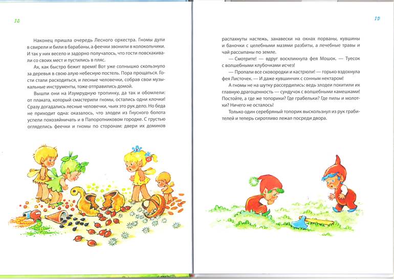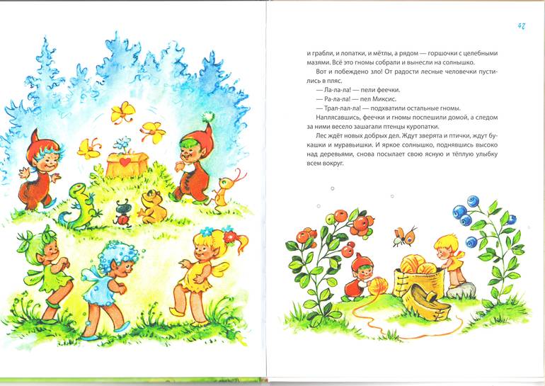 В конце обзора по традиции о качестве. Большой формат 22х30 см. Твердая матовая обложка, белые плотные матовые страницы. Яркие самобытные иллюстрации, крупный шрифт. Отличное качество печати, как текста, так и рисунков. Мы очень рекомендуем эту книгу всем любителям гномиков, фей, лесных приключений, добрых сюжетов и сказочного волшебства.