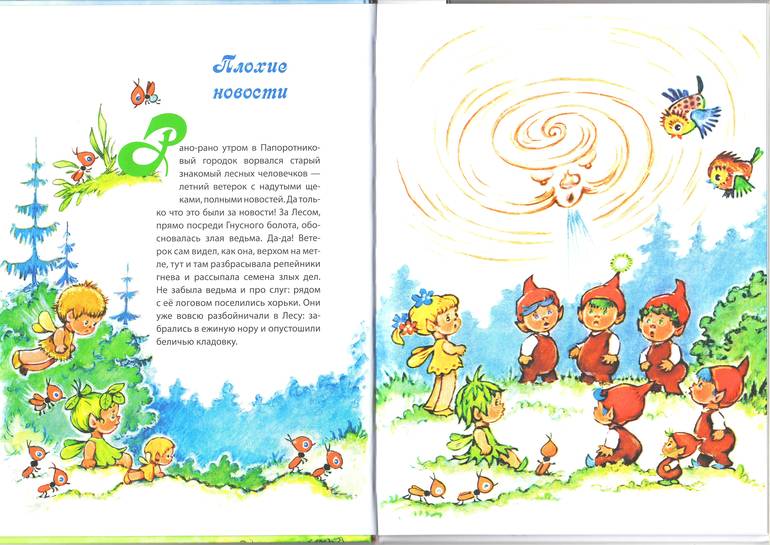 Возраст маленьких читателей - от 3-3,5+. Текста на разворотах много, да и сказка не такая уж и короткая (50 страниц). Удивлена большим количеством отрицательных отзывов на книгу "Приключения маленьких человечков", из минусов в основном: скучная история, недодуманный примитивный сюжет, слишком просто... Друзья, да ведь это же детская сказка для малышей, ребят дошкольного возраста! Не ожидайте от нее напряженности и закрученности сюжета, скрытой морали или философских размышлений. Сюжет самый что ни на есть прямой и понятный: есть добро и есть зло. Добро - это гномы и феечки, они трудолюбивы и отзывчивы, помогают во всем другим жителям леса. Они отважны и решительны, решают идти сражаться со злодеями, имея в активе только один серебряный топорик и свои отважные сердца. Злодеи - рассыпают семена злых дел и репейники гнева, опустошают кладовки и растягивают колючие сети, обижают лесной народ, крадут у них вещи. А конце сказки гномики побеждают злодеев, и все опять счастливы)