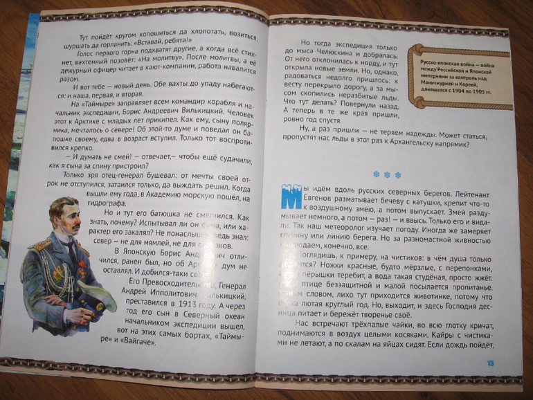 А сами истории интересные, безусловно. Автор рассказала в книге о экспедиции Вилькицкого и о том, как два судна русского императорского флота "Вайгач" и "Таймыр" первыми одолели Великий северный путь, идя по нему с востока на запад. Кроме того не забыта и героическая зимовка 1915 года. И быт моряков описан, и животные морские упомянуты, и сносок много дано для понимания различных терминов морских и прочего. Но вот автор только перестаралась слегка с языком, хотя может это мне только так кажется.