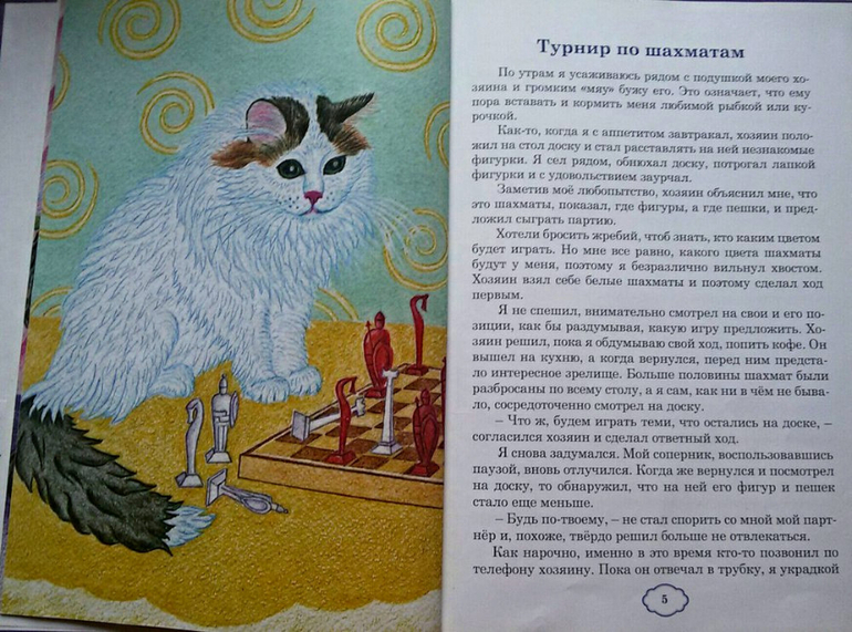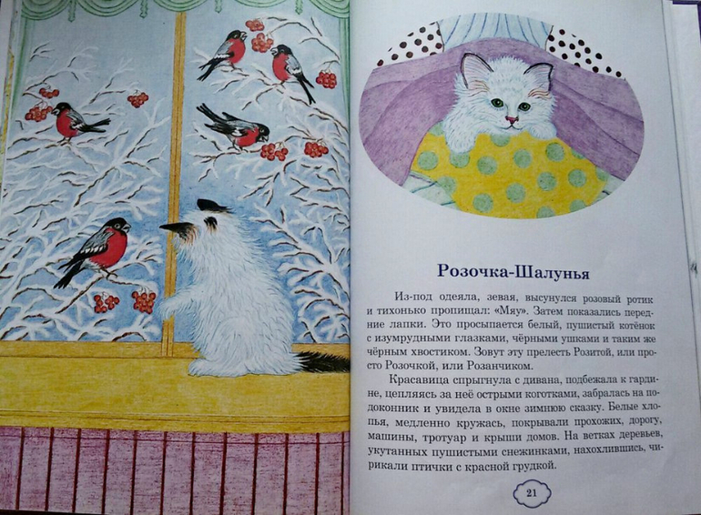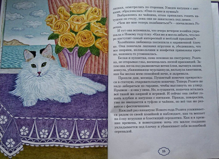 Дочка схватила книгу про котиков, она их безумно любит, а тут они просто очаровательны. А вот текст сказок меня немного озадачил. Они вроде добрые, поучительные и даже с юмором, но не затрагивают. В них больше описательно-философского, чем задорного и игривого. Но написаны сказки очень хорошим певучим языком. На слух очень приятны, читаешь и наслаждаешься интересными оборотами, неспешным, спокойным повествованием. Но ребенок особого интереса не проявил. Дочка соглашалась выслушать лишь одну сказку за вечер. Мне кажется, она не столько слушала, сколько разглядывала иллюстрации. Вот они ее точно покорили, особенно пушистые, милые котики.