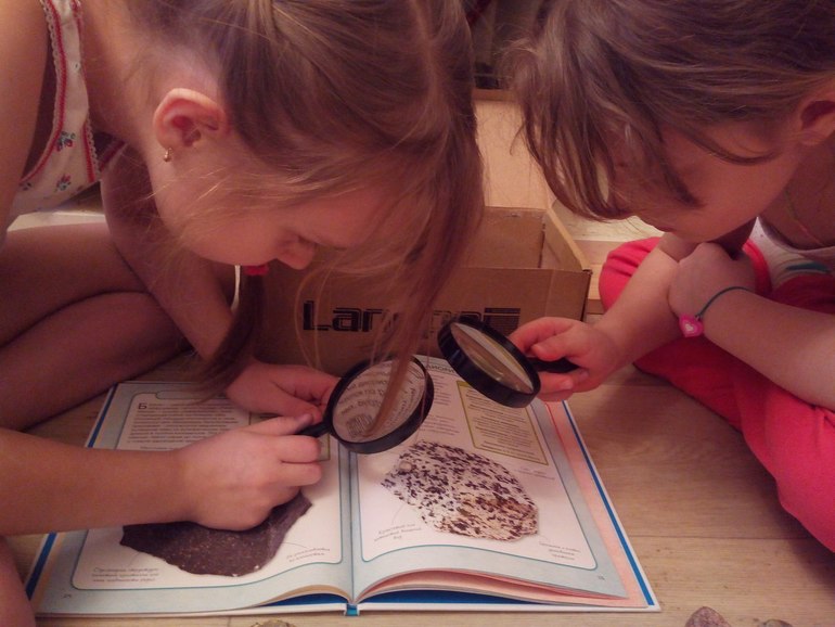 С приходом весны мои дети вдруг с увлечением начали собирать коллекцию обычных, уличных камушков, насобирав уже неплохую коллекцию. Я решила поддержать их интерес, сделать им маленький сюрприз и положила в новый интернет заказ книжку и лупы.