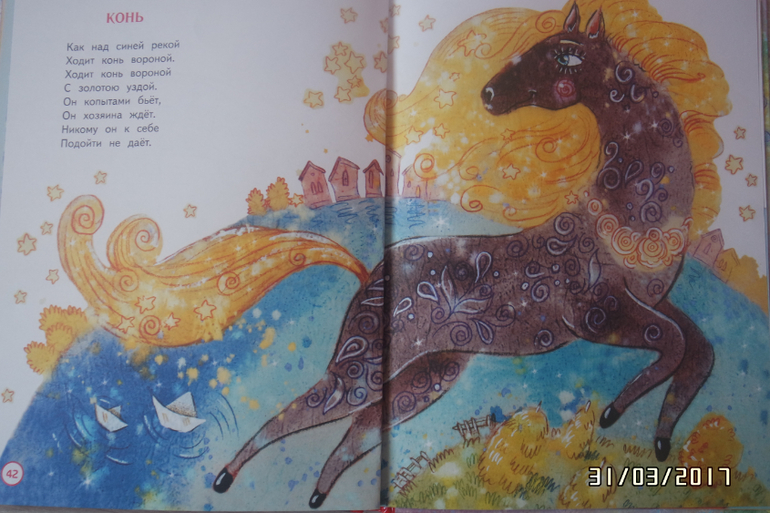 (Ну, какая милая лошадь с щечками и лужами с завитушками. Мои дети любят делать такие завитушки из пластилина и украшать ими поделки. Так что в новой книге сразу заметили завитушки)