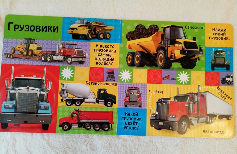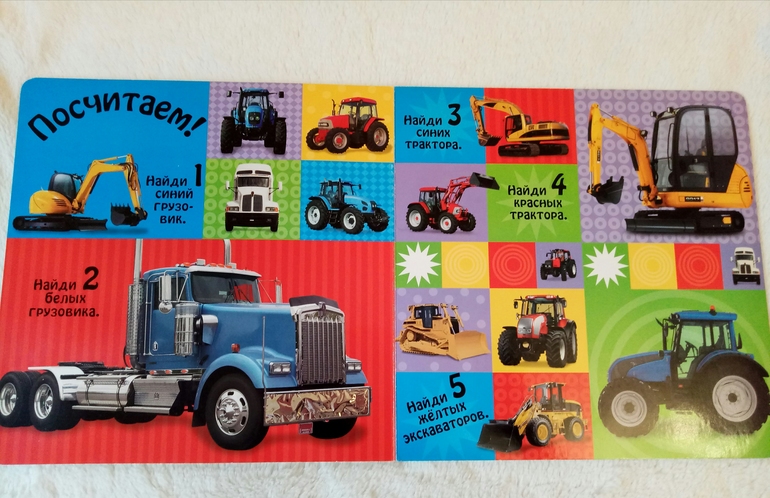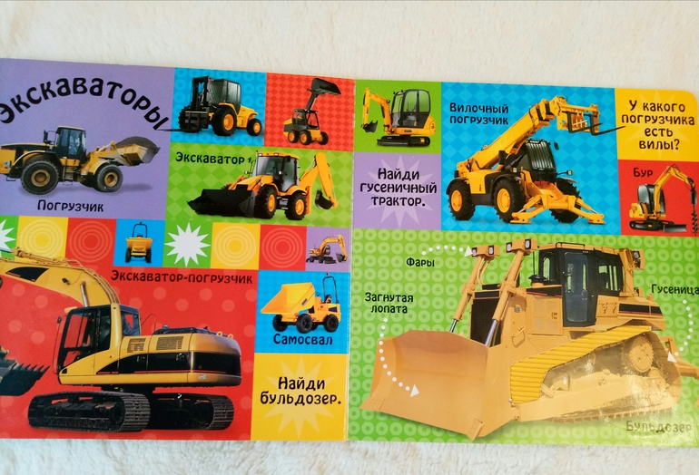 Мы подолго рассматриваем книгу, изучаем различные виды транспортов, а тут есть что изучить!Есть и грузовики, и экскаваторы, бетономешалки, и колесные и гусеничные трактора.