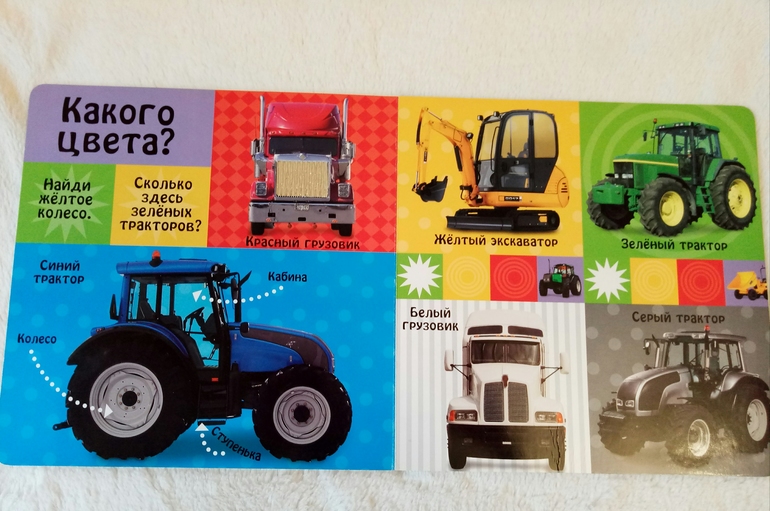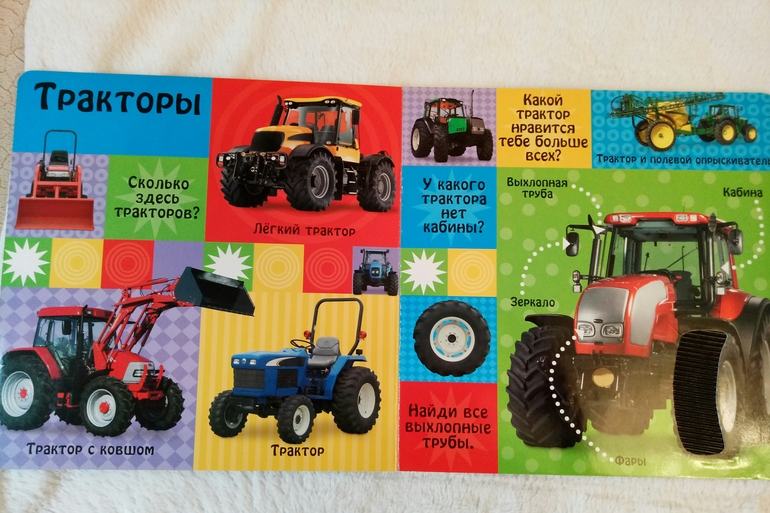 Книга у нас второй год, и любовь к ней не слабеет!Таскает постоянно. Я когда ее покупала, очень переживала, что будет однодневкой, потому как цена у нее не маленькая. Но вот спустя год могу сказать честно, абсолютно не жаль потраченных денег!это самое то для мальчишек! столько разных ярких машин!Я и купила ее именно на волне любви к тракторам)
