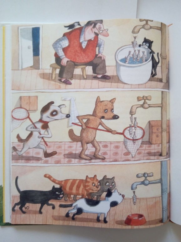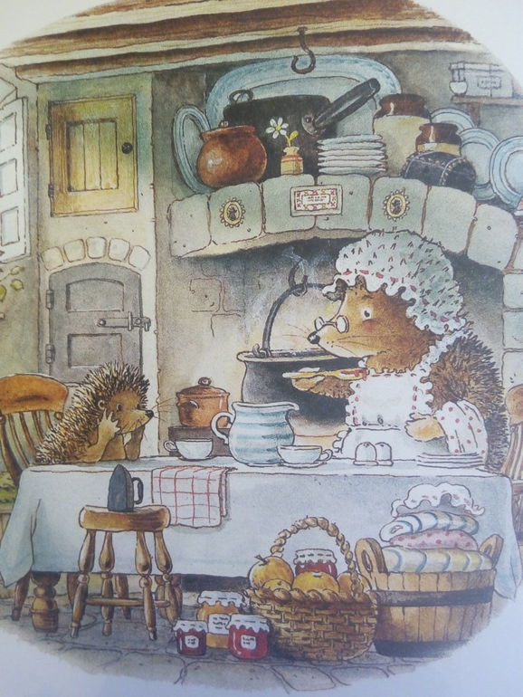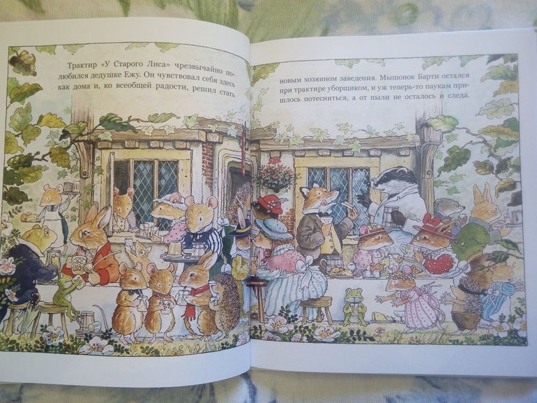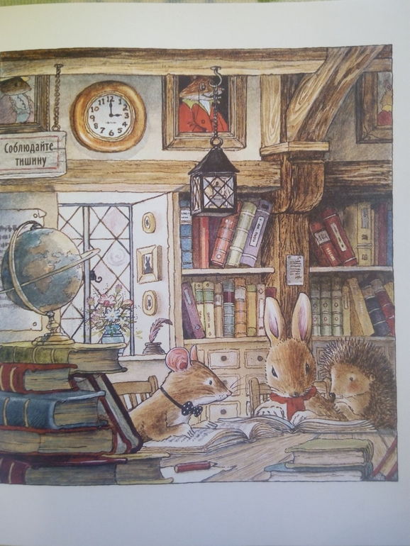 Это новое переиздание сказок ежевичной поляны. В одной книге собраны 3 истории. Книгу ещё не читали. Но иллюстрации я сама люблю листать разглядывать. Подмечать мелкие и интересные детали. Нравится, что все надписи на иллюстрациях написаны на русском языке.