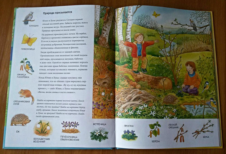 Это наша вторая книга из серии "Находилки-развивалки". Детям она приглянулась больше зимней, хотя и та нам понравилась. Переводная книга про немецких ребят Юлию и Лукаса, которые радуются приходу весны. Они очень любознательные и вместе с ними малыш узнает много интересного. Какие цветы весной распускаются первыми. Что за весенний праздник - Пасха. Когда появляются утята и прилетают первые ласточки. И еще много всего познавательного про лес, птиц, зверей и насекомых.