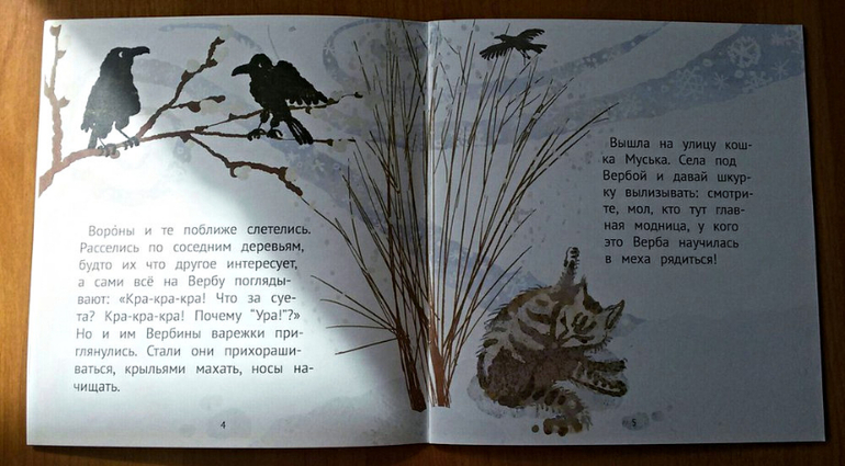 Надоело Вербе мерзнуть, решила она согреться и надела пушистые варежки. Увидали это птицы и понесли по всему лесу новость: "Верба варежки одела!" Никак Морозу к принарядившейся Вербе не подступиться, не боится она больше холода. Потоптался Мороз, потоптался, да и ушел по другим делам. До следующей зимы.