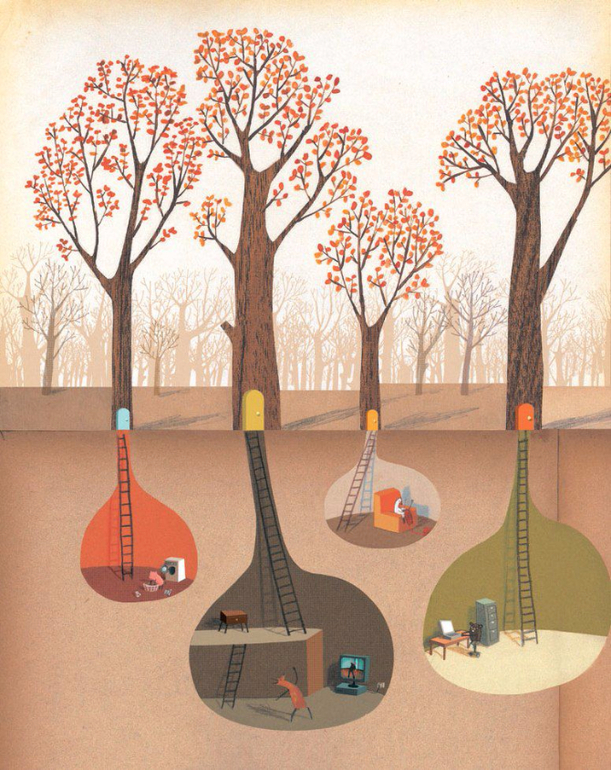 В книге А. Введенского "Много зверей" дело обстоит так: поэт решётку видит ясно, и что обитатели зоопарка "не желают в нём томиться, а желают удалиться", замалчивать не собирается. Его стихи почти целиком об этом: даже слова "клетка" и "решётка" встречаются в них по нескольку раз! А вот художник Вера Ермолаева решает, что, раз в стихах всё сказано прямо, она может страшную решётку на изображения зверей не "надевать". На её рисунках оградки, сетки и прутья не исчезают совсем, но становятся частью художественной игры: узором, намёком, кусочком орнамента - незамкнутым и потому не опасным.