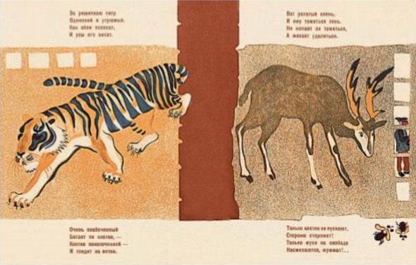 В 1920-х годах городской зоопарк часто становился темой детских стихов, а изображать зоосад в книжках-картинках было своеобразной традицией. Перед поэтом, сочиняющим для детей про зоопарк, и художником, его рисующим, всегда встаёт "проблема решётки". Замечают ли её звери, тоскуют ли они в неволе или, наоборот, довольны сытой и безопасной жизнью? Видит ли железные прутья праздношатающийся зритель или смотрит на зверей сквозь них, будто ничто и не отделяет его от дикой природы?