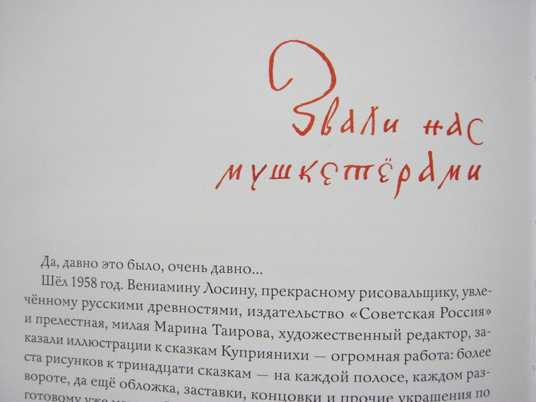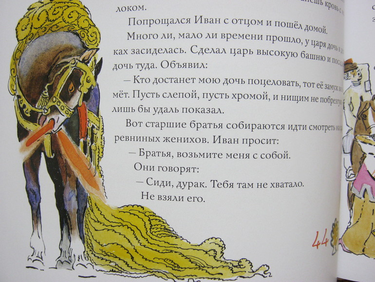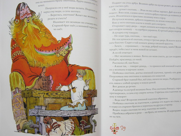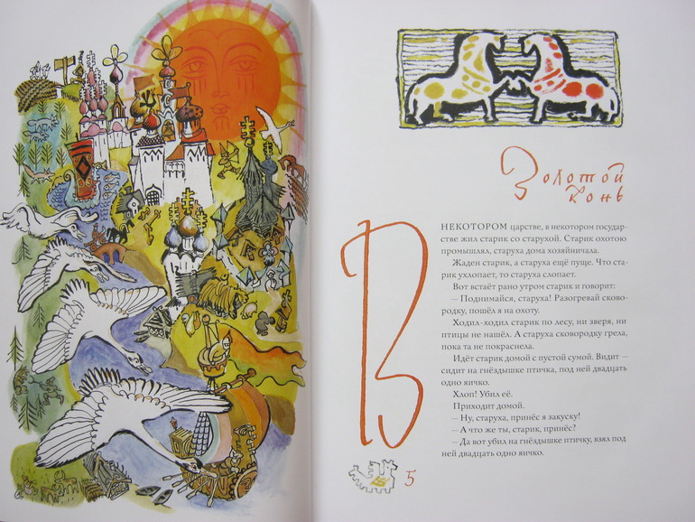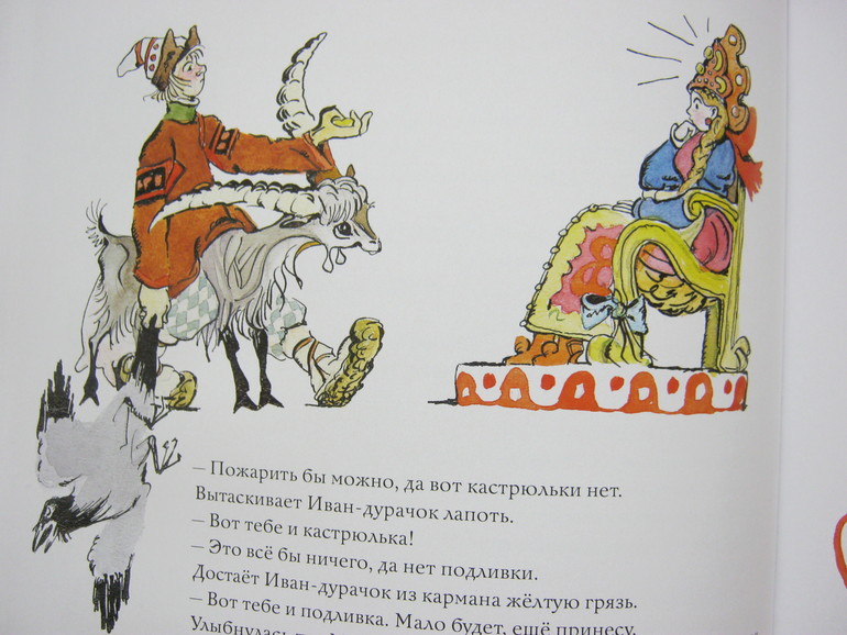 В ней все гармонично - молочная матовость обложки и рельефная выпуклость рисунка и заголовка, масляно-желтые форзацы и белые мелованные страницы, расположение текста и иллюстраций и красные небрежно-быстрые надписи названий сказок.