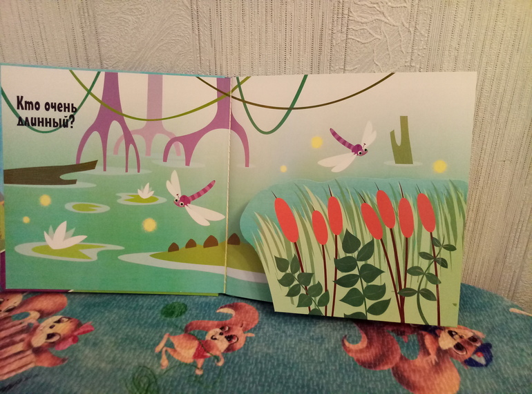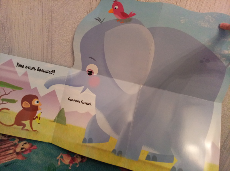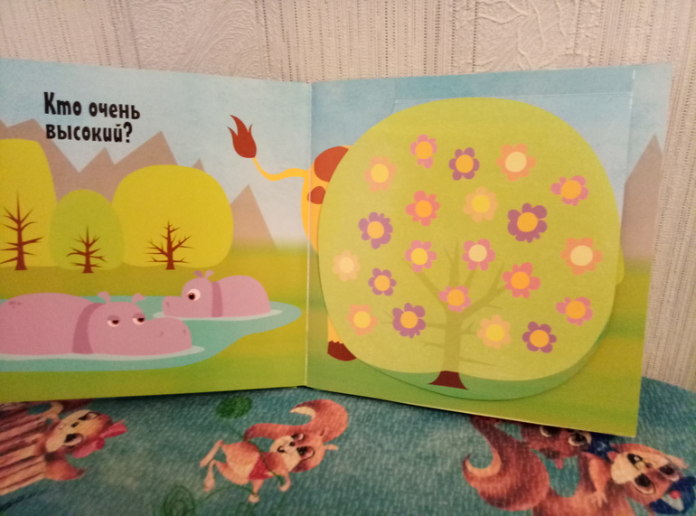 И вторая книга Кто высокий из серии Отогни и посмотри. Куплена давно, и долго лежала невостребованная. Но тут как то мелкий сам ее с полки достал и стал читать, играть. В книги всего пять разворотов. Рисунки в таком минимальной стиле, особо рассматривать нечего, чтоб от главного не отвлекаться) А главное в этой книге изучение понятий высокий, длинный, маленький , большой и необычные клапаны.