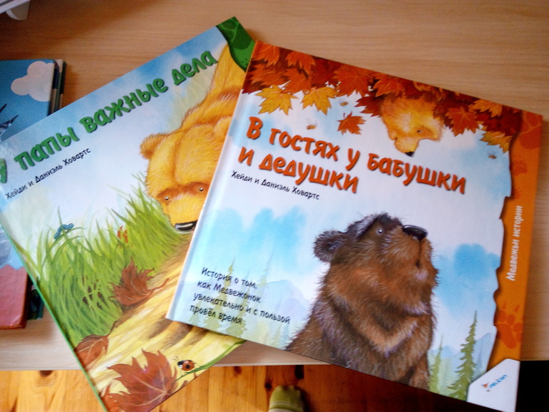 У нас продолжительный хит - "В гостях у бабушки и дедушки" (только, кажется, она у нас называется "Старые медведи не умеют лазать по деревьям"). Уже несколько месяцев обязательно приносят читать.