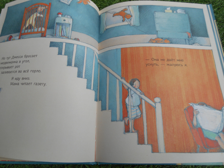 "Пора спать, Джесси!" - новая для нас книга, да еще и проза. Читали 2 раза, пока больше не пошло. Книга своеобразная в плане подхода к воспитанию. Здесь о взаимоотношениях старшего и младшего ребенка в семье, о том как старшая помогает уложить таки спать младшую. Очень по-настоящему, но подход совершенно не российский, что не удивительно, так как книга переводная. Мама уложила ребенка спать и, несмотря на то, что та не заснула, занимается своими делами, читает газету, а папа смотрит телевизор. Уложить ребенка пытаются все по очереди: мама (поет песенку), папа (увозит малышку на машине, наворачивает круги вокруг дома, пока та не заснет) и старшая сестра, которая в итоге ложится к ней в кроватку, и так в обнимку они засыпают.