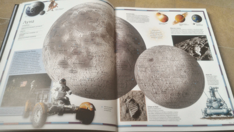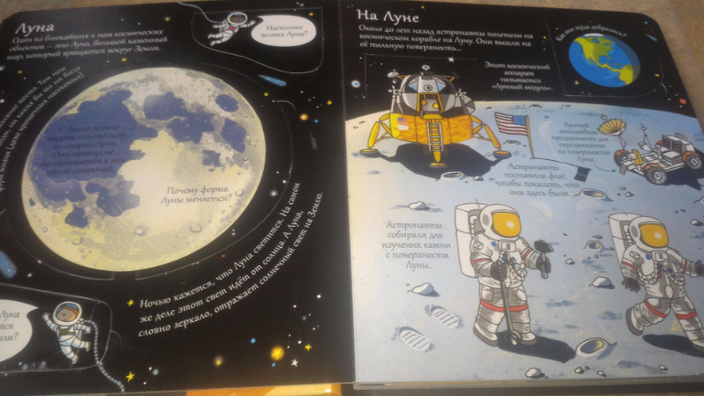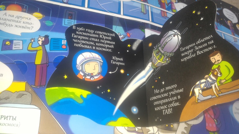 Очень жаль, что про Гагарина здесь совсем чуть-чуть, и только в конце. А про Леонова вообще ничего. Зато покорению Луны американцами уделен целый разворот