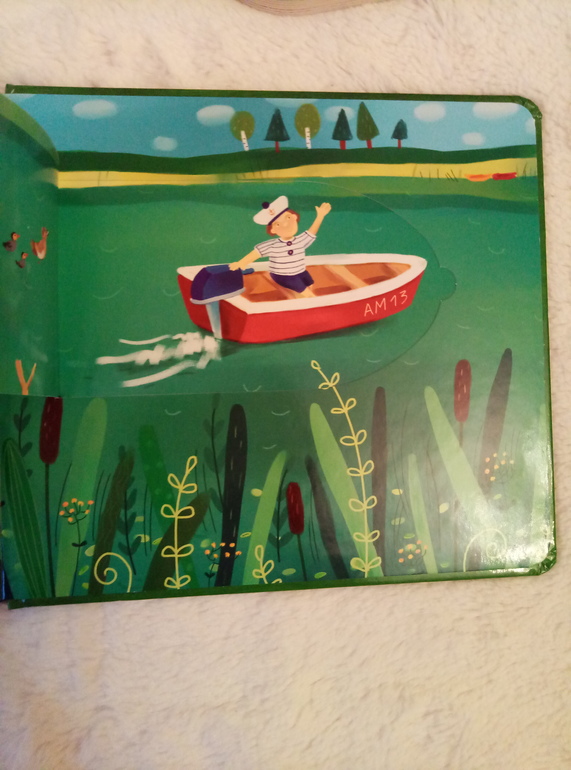 Да, рисунки здесь немного в примитивном стиле, и носы картошкой) но милые и детские) и еще что для меня послужило поводом купить именно эту книгу, персонажей из деревни и леса очень много в других книгах, и в энциклопедиях, и в художественных произведениях, в сказках. коровы, курицы, ежики, мишки, волки везде) а комарики и ужи, а тем более моторные лодки встречаются не так часто) так что мы за разнообразие)