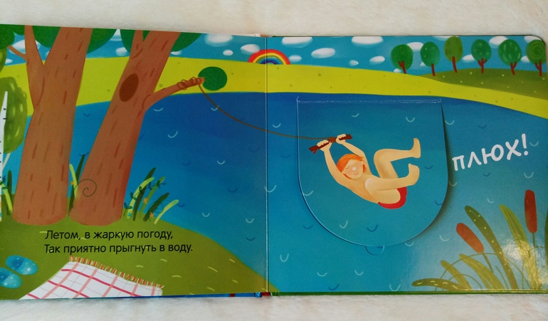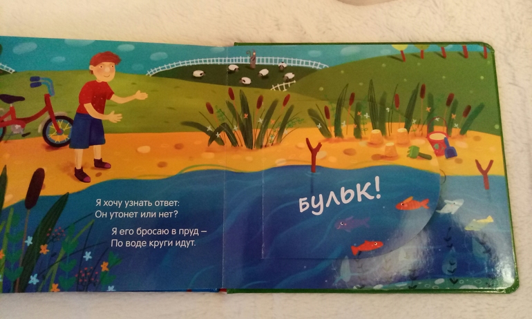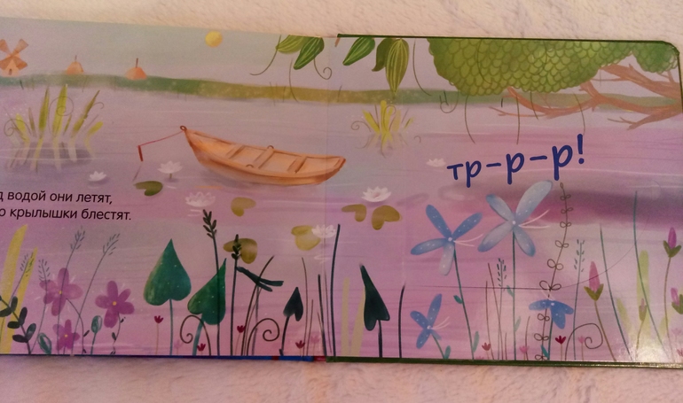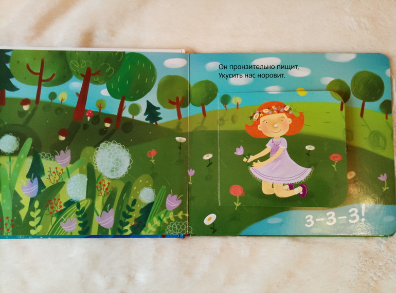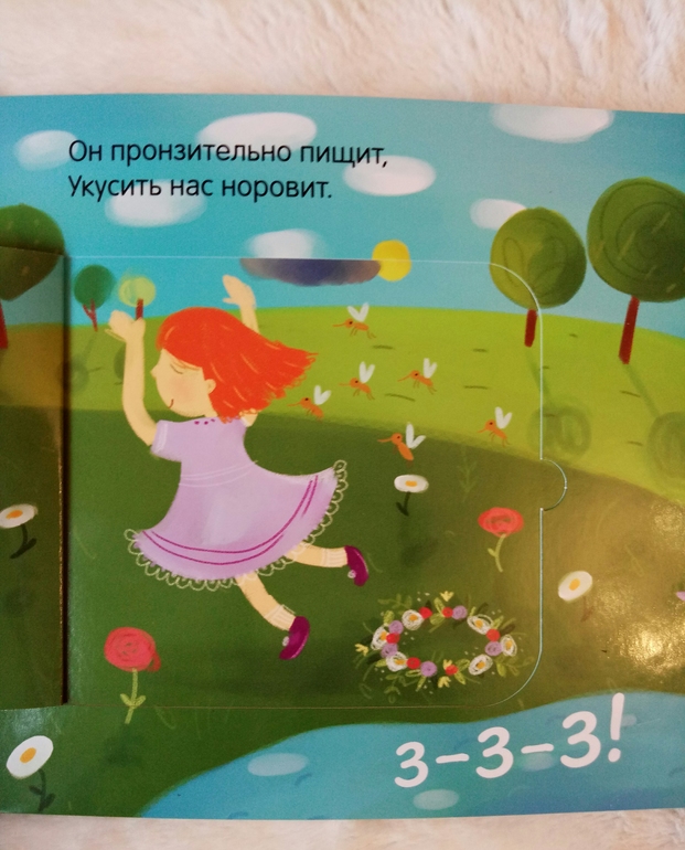 Я долго выбирала ну какие же из 4 представленных приобрести нам) хотелось, конечно, все)) В книжках на каждом развороте небольшое предложение- загадка, звукоподражание и под клапаном отгадка. Самое то для маленьких исследователей, начинающих говорить. Выбор книг происходил летом, которое мы проводили большей частью на даче. И посмотрев Что мы слышали на речке, я поняла, вот, это наше лето) Вот комары, куда ж без них)