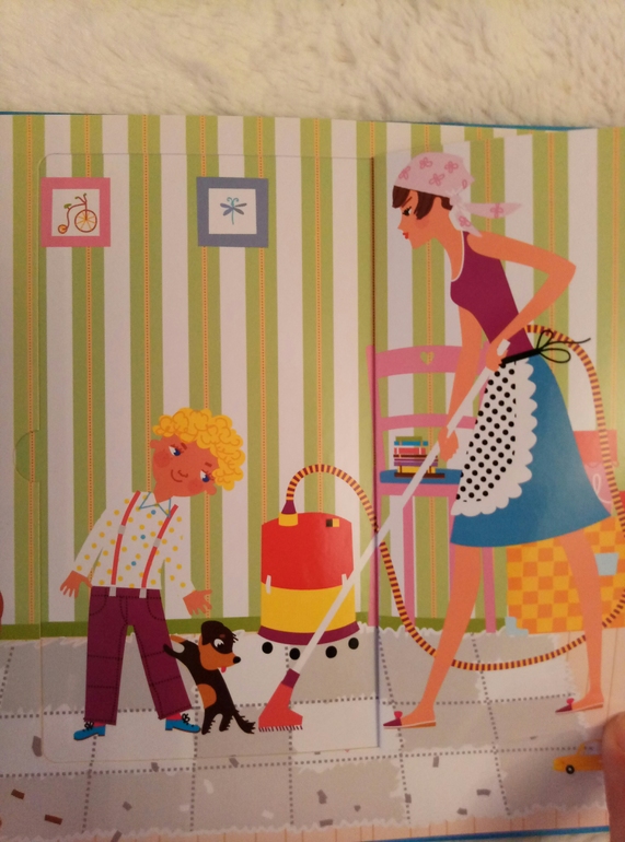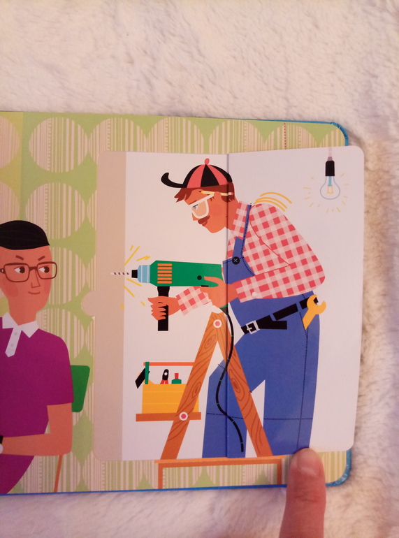Поэтому была выбрана и вторая, что мы слышали дома. В ней показано все то, что окружает малыша дома, что ему близко и понятно, а дети очень любят находить в книге, то, что можно увидеть, потрогать в реале. Наша безумная любовь к этой книге началась после того, как папу с дрелью увидели)